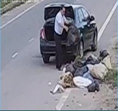 Dừng xe bên đường vô tư xách từng túi ni lon rác vứt xuống đường |