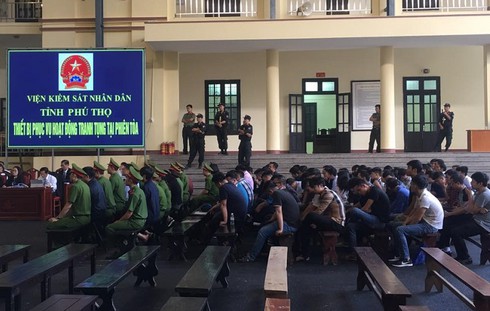Các bị cáo ngồi nghe đồng phạm trả lời HĐXX. |