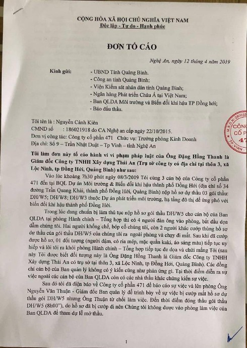 Trong đơn gửi các cơ quan chức năng đề ngày 12/4/2019, ông Nguyễn Cảnh Kiên - Trưởng phòng kinh doanh và ông Nguyễn Hữu Mạnh, Phó phòng (Công ty Cổ phần 471) tố cáo đích danh “hành vi vi phạm pháp luật của ông Đặng Hồng Th. là giám đốc Công ty TNHH Xây dựng T.A (có trụ sở công ty tại thôn 3, xã Lộc Ninh, thành phố Đồng Hới).