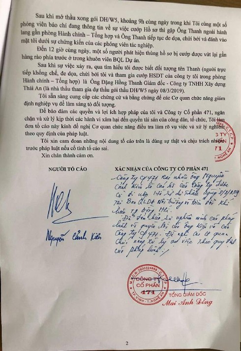 “Sau khi mở thầu xong gói DH/W5, khoảng 9h cùng ngày, tôi cùng một số phóng viên báo chí đang thông tin về sự việc cướp hồ sơ thì gặp ông Th. Ngoài hành lang gần phong Hành chính-Tổng hợp. Ông Th. Tiếp tục đe dọa, chửi bới và đánh vào mặt tôi trước sự chứng kiến của các phóng viên tác nghiệp” – ông Kiên trình bày trong đơn.