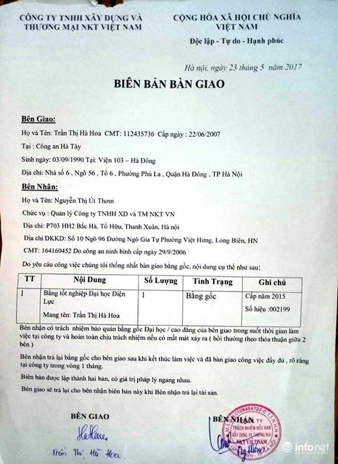 Theo tìm hiểu của PV Infonet thì trong biên bản bàn giao vào ngày 23/5/2017 cho thấy, bằng gốc đại học của chị Hoa do bà Nguyễn Thị Út Thơm, đại diện Công ty TNHH Xây Dựng và Thương mại NKT Việt Nam lập và giữ. Tuy nhiên, khi phóng viên hỏi về vụ việc, bà Thơm không trả lời và coi như không biết.