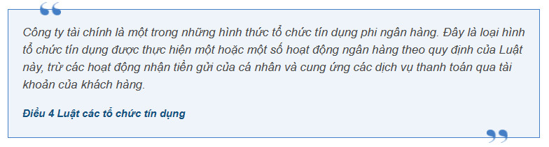 Công ty tài chính: Hoạt động theo Luật các tổ chức tín dụng, chỉ khi được Ngân hàng Nhà nước cấp phép mới được gọi là công ty tài chính. Hiện có 16 công ty tài chính được Ngân hàng Nhà nước cấp phép, gồm: PTF finance, FCCOM, EVNFinance, HAFIC, Lotte Finance Vietnam, Mirae Asset Finance Vietnam, FE Credit, HD Saison, Home Credit, Shinhan Finance, JACCS, VSFC, Tài chính Toyota Việt Nam, SHB Finance, VietCredit, M Credit.