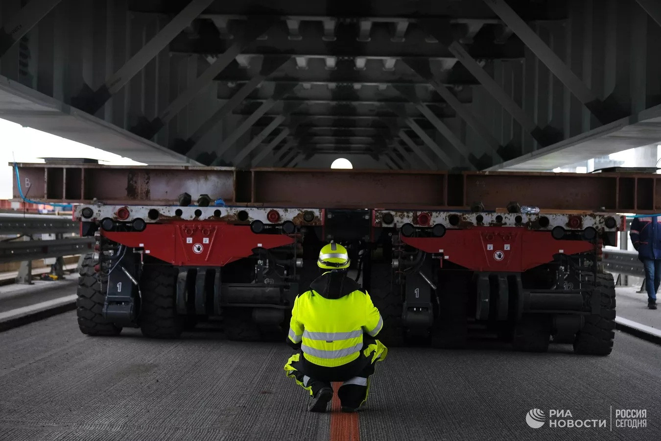 “Đơn vị xây dựng bắt đầu vận chuyển nhịp cầu xây mới hoàn toàn, nặng hơn 300 tấn. Cấu trúc đồ sộ này được được vận chuyển bằng mô-đun tự hành nhiều bánh”, ông Khusnullin cho biết hôm 7/11.