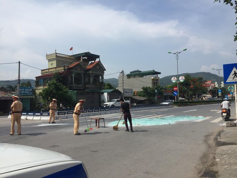 Lực lượng CSGT Quảng Ninh vừa phân luồng vừa thu dọn kính vỡ |