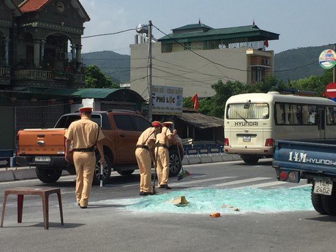 Lực lượng CSGT Quảng Ninh "đày nắng" quét dọn kính vỡ trên Quốc lộ 18 |