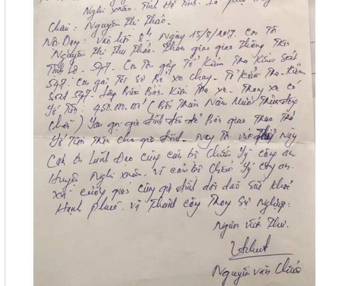 Cảm động trước việc làm đầy ý nghĩa của CSGT, ông Chiến đã viết thư cảm ơn Công an huyện Nghi Xuân, Công an xã Cương Gián và 03 đồng chí trong Tổ tuần tra.
