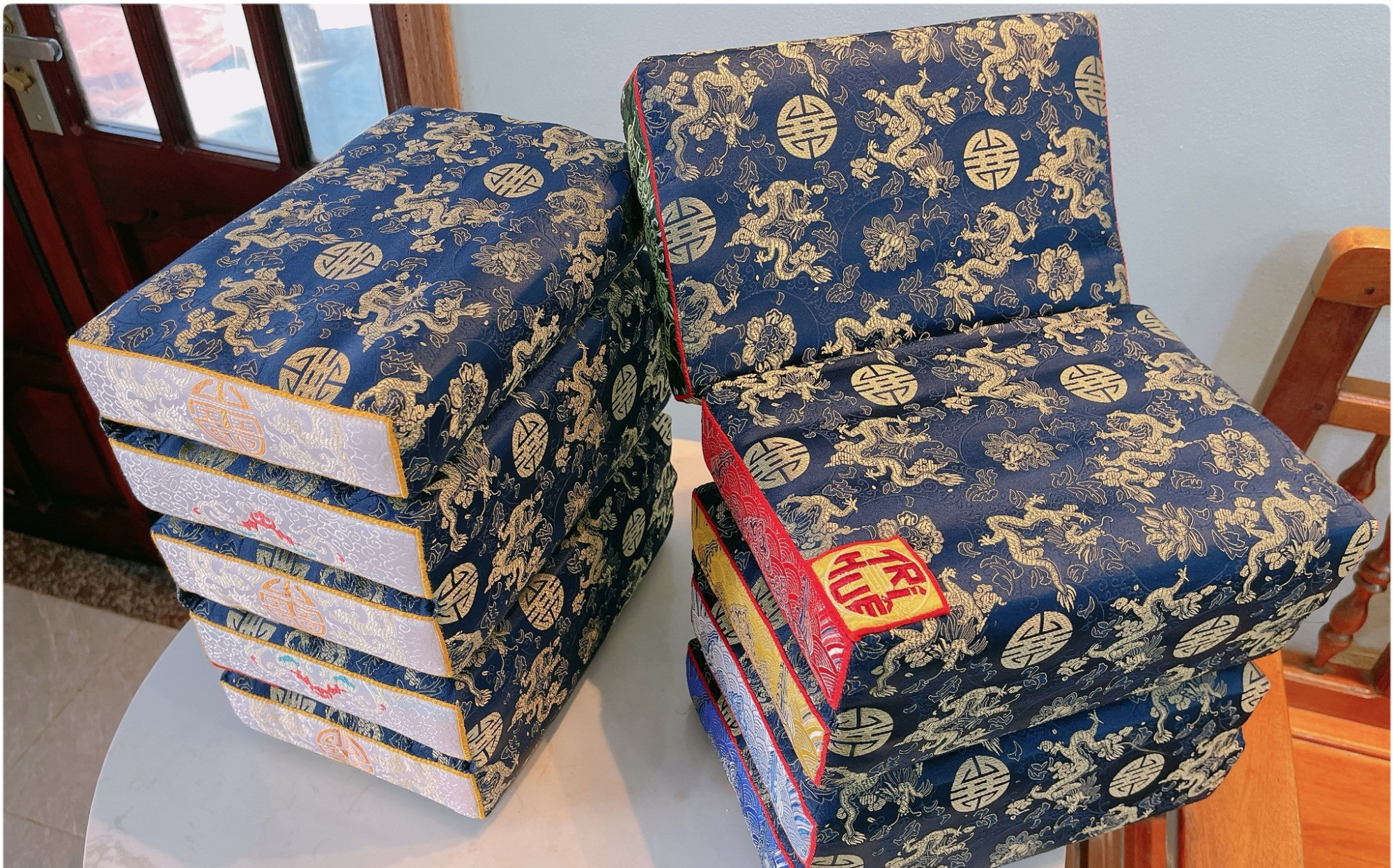 Để hoàn thiện một sản phẩm gối cung đình, 3 người trong nhà cụ cùng nhau làm trong suốt 3 ngày. Mỗi sản phẩm trung bình có giá khoảng 1,8 triệu đồng, tùy theo yêu cầu của khách hàng.