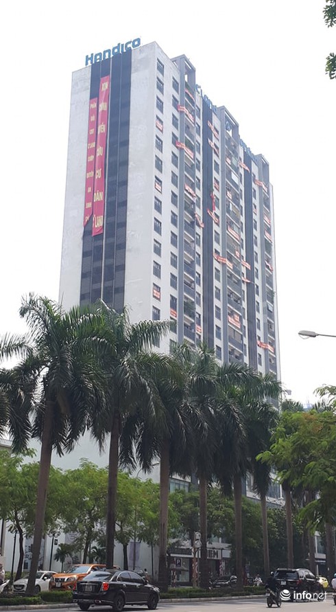 Cư dân CT3 số 81 Lê Đức Thọ treo băng rôn quanh nhà phản đối việc chủ đầu tư cắt nước sinh hoạt. Ảnh: Minh Thư. |