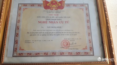 Cụ Bình được Chủ tịch nước tặng danh hiệu Nghệ nhân ưu tú ở loại hình nghệ thuật trình diễn dân gian. |