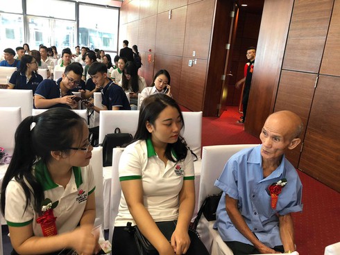 Cụ sinh viên Cao Nhật Linh trò chuyện cùng với các sinh viên đồng khóa trong lễ khai giảng |