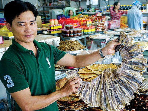 Khô cá đuối đen không thể thiếu trong mỗi quầy hàng cá khô xứ biển. |