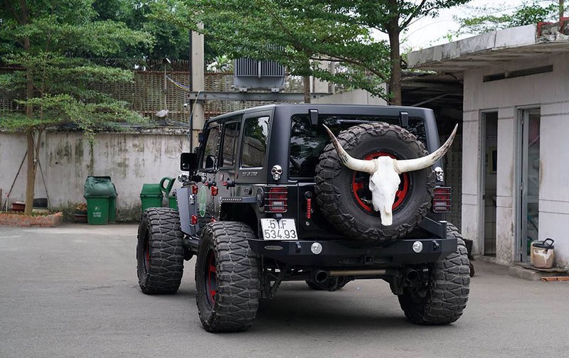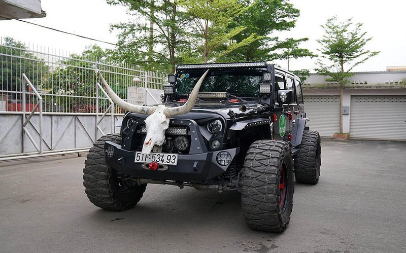 Chiếc "Jeep Vương" gây chú ý với cách chơi xe "không đụng hàng", với hình ảnh lốp địa hình choãi ra đường, cản trước hầm hố và đặc biệt được vị chủ nhân gắn thêm cặp sừng phía trước.