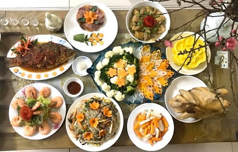 Mâm lễ bao gồm: Gà luộc, xôi hoặc bánh chưng, cơm canh.