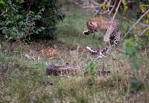 Ban đầu, con báo có vẻ thất thế khi bị con trăn khổng lồ lao tới tấn công xiết chặt người. Nhưng con báo nhanh chóng thoát được vòng vây và đáp trả bằng những vết cắn chí mạng.