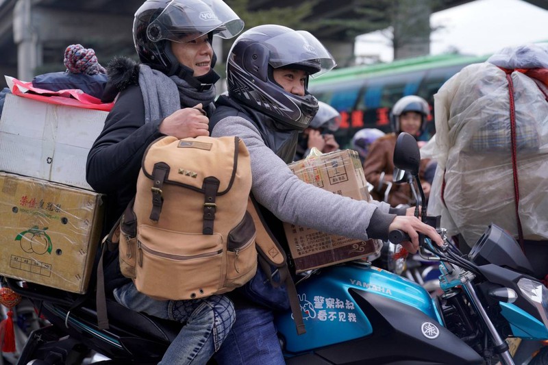 Pan Nanxiong, 56 tuổi là một trong những người lao động xa nhà về quê ăn tết chọn phương tiện xe máy để đi lại. Quê anh cách nơi làm 400 km. Pan Nanxiong cho biết: "Cả tàu và xe khách đều không thể đến thẳng nhà. Vì vậy tôi đã chọn đi xe máy, đây là cách rẻ nhất, đỡ tốn tiền". |