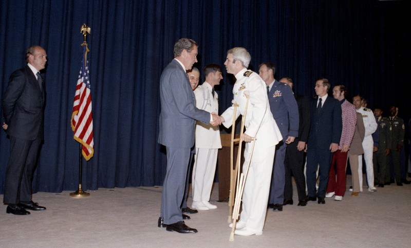 Tổng thống Richard Nixon bắt tay Đại tá John McCain tại Washington tháng 5/1973 sau khi ông này trở về Mỹ. |