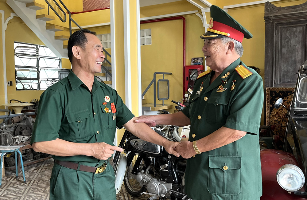 Ông Phan Văn Hôn và ông Trần Văn Chinh trong cuộc hội ngộ bất ngờ tại garage Biệt động Sài Gòn 499/20 đường Cách Mạng Tháng Tám, quận 10. Ảnh: Sao Mai
