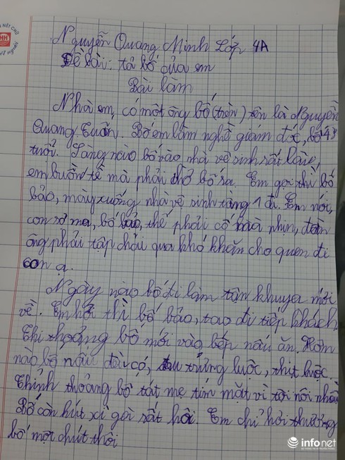 Chia sẻ với Infonet, cô giáo xin được giấu tên cho hay: "Bài văn tả bố là một bài tập ngắn trong chương trình phụ đạo của giáo viên dành cho học sinh. Đọc bài làm của học sinh mình thấy rất bất ngờ, thích thú trước giọng văn chân thật, ngô nghê khi tả thực của học sinh.