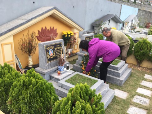 Vợ chồng cô Nhã cùng nhau chăm sóc phần mộ của gia đình. |