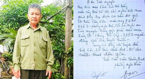 Trong đơn tình nguyện đóng góp cho quỹ phòng chống dịch Covid-19 ở địa phương, cựu chiến binh Trần Văn Vân (74 tuổi, trú ở phường Nghi Hòa, TX Cửa Lò, Nghệ An) viết: “Tôi tình nguyện đóng góp phần nhỏ mọn của tôi là 1 tháng trợ cấp (3.350.000 đồng) gửi lên tuyến trước. Mong các đồng chí tuyến đầu tích cực, kết thúc chiến dịch để cho nước thịnh, dân yên”.