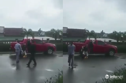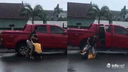 Sự việc diễn ra giữa một khoảng sân khá rộng, bên cạnh một chiếc xe bán tải màu đỏ. Ban đầu anh này mở cửa sau và lôi người phụ nữ vào xe nhưng không được. Sau đó anh ta cố bế chị này lên nhưng chị ta lại giãy giụa và kháng cự lại. Vì thế anh này giật tóc, đấm, đá túi bụi vào người rồi đè ngửa cô gái nằm xuống sân và ngồi đè lên người.
