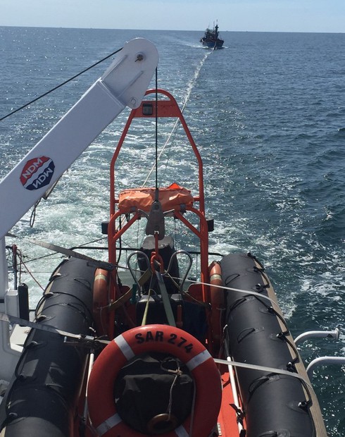 Tàu SAR 274 lai dắt tàu cá về bờ. |
