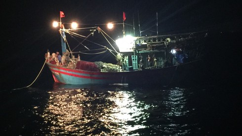 Tàu cứu hộ tiếp cận tàu cá lúc nửa đêm. |