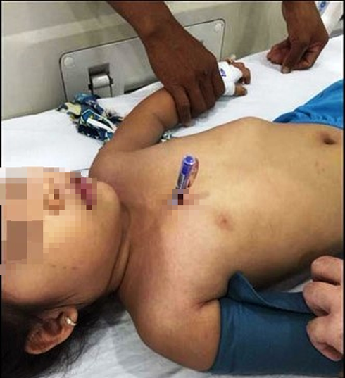 Theo thông tin từ người nhà bệnh nhi, khoảng 18h chiều 18-5, bé đòi ba cho cây bút bi chơi. Trong lúc cầm chơi thì bé bị vấp té, khiến cây bút đâm thấu vào ngực.