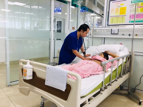 Người bệnh nhập viện trong tình trạng tỉnh táo, tuy nhiên mệt, da tái, đau bụng dữ dội, mạch nhanh, huyết áp tụt 80/50mgH. Các bác sỹ đã tiến hành hồi sức, truyền dịch, đặt đường truyền tĩnh mạch trung tâm, đặt catheter động mạch, theo dõi huyết áp liên tục đồng thời thực hiện các chỉ định cận lâm sàng kết quả chẩn đoán bị viêm tụy cấp hoại tử , Balthazar E trên người bệnh mang thai 37 tuần.