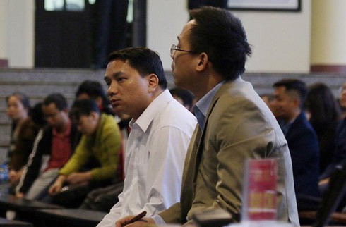 Ông Hoàng Xuân Phóng và Nguyễn Huy Lục nghe Chủ tọa phổ biến quyền và nghĩa vụ của người làm chứng. |