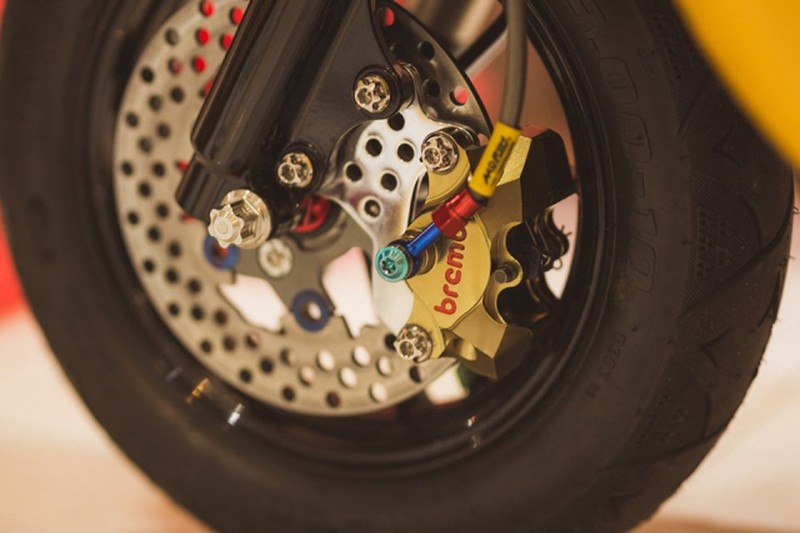 Phần vỏ phuộc nơi dàn chân trước được tạo kiểu lại trông khá đẹp, kết hợp cùng chú heo dầu Brembo 2 pis đối xứng kèm sợi dây dầu Morin của Thái Lan và đĩa thắng đồ chơi, tất cả đã hòa hợp cùng với nhau để tạo nên một dàn chân hài hòa.