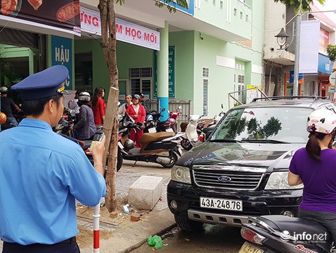 Thanh tra Sở GTVT Đà Nẵng xử lý xe ô tô đậu đỗ trái quy định trước cổng cơ sở 2 trường tiểu học Trần Cao Vân trong ngày khai giảng năm học mới 2019 - 2020 (Ảnh: HC) |