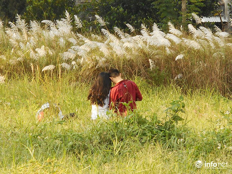 Hai lữ khách nước ngoài dừng chân ngắm bông lau