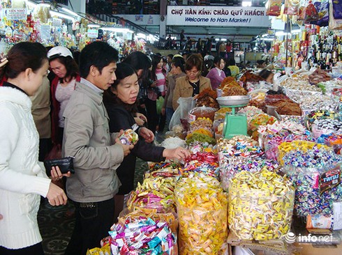 Người dân đến chợ Hàn (Đà Nẵng) mua sắm các loại bánh, kẹo, mứt... phục vụ ngày Tết (Ảnh: HC) |
