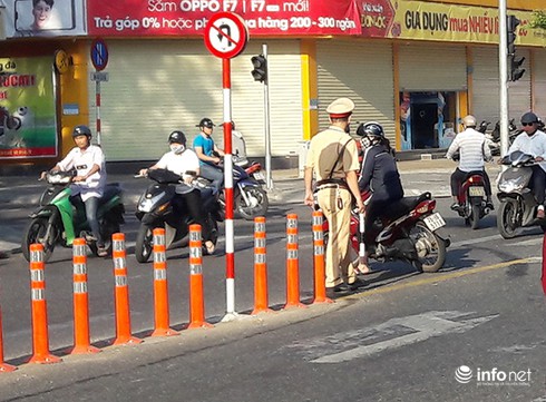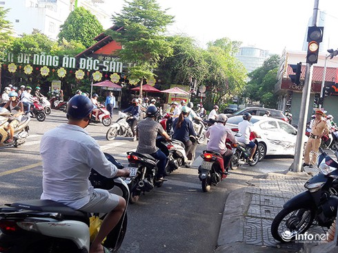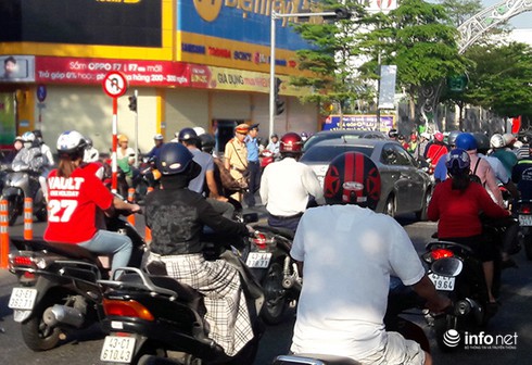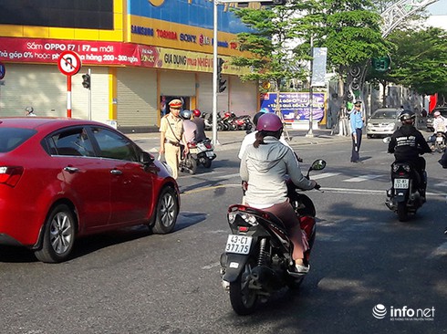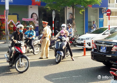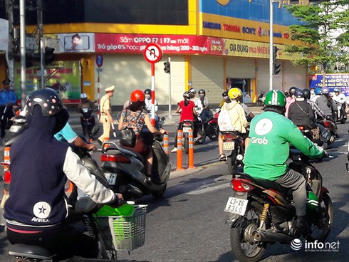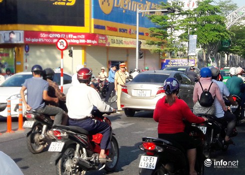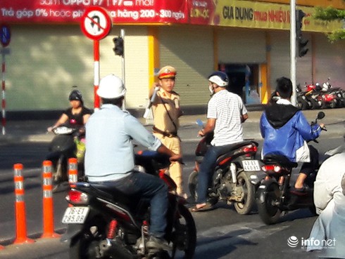CSGT Đà Nẵng bất lực nhìn hàng loạt xe máy quay đầu trái luật trên đường Lê Duẩn sáng 23/5 để lên cầu Sông Hàn (Ảnh: HC) |