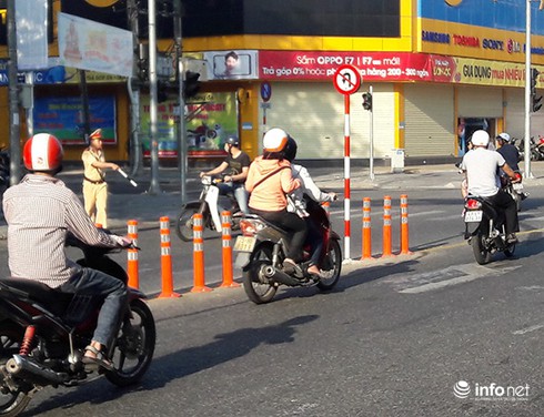 Bất chấp dải cọc tiêu phân làn đã được kéo dài tới gần sát ngã ba Lê Duẩn - Yên Bái... |