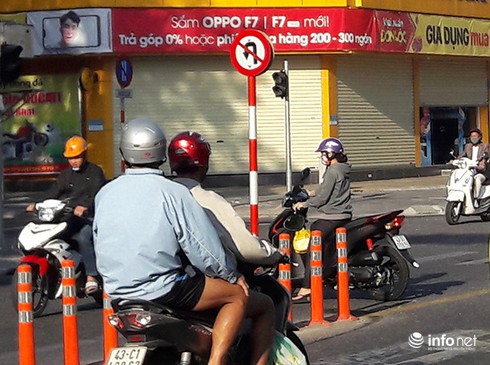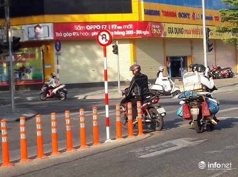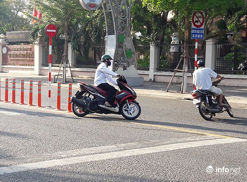 Vậy mà theo quan sát mới nhất của PV Infonet sáng 23/5, tại vị trí cắm các biển báo này, tình trạng xe máy quay đầu trái luật ngay giữa đường Lê Duẩn để lên cầu Sông Hàn hoặc rẽ phải qua đường Trần Phú vẫn tiếp tục diễn ra, khiến giao thông khu vực tiếp tục lộn xộn, ùn tắc, xung đột và ẩn chứa nhiều nguy cơ xảy ra tai nạn.