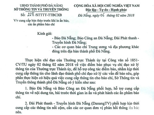Ngày 7/2, Sở TT-TT Đà Nẵng đã có Công văn số 228/STTTT-TTBCXB gửi báo Đà Nẵng, báo Công an Đà Nẵng, Đài Phát thanh – Truyền hình Đà Nẵng cùng các cơ quan báo chí Trung ương và địa phương khác đóng trên địa bàn TP về việc cung cấp bản thảo trước khi in ấn báo, các ấn phẩm báo chí.