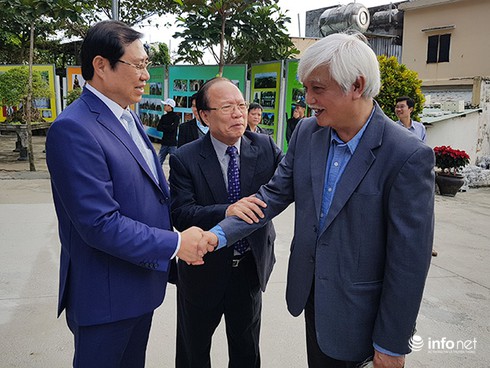 Nhà sử học Dương Trung Quốc chúc mừng nguyên Bộ trưởng VH-TT-DL, nguyên Chủ tịch UBND TP Đà Nẵng Hoàng Tuấn Anh (đứng giữa) và Chủ tịch UBND TP Đà Nẵng Huỳnh Đức Thơ nhân sự kiện đón bằng xếp hạng Di tích quốc gia đặc biệt danh thắng Ngũ Hành Sơn (Ảnh: HC) |