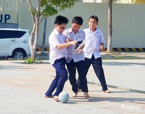 Các trường học ở Đà Nẵng đang rất thiếu sân thể thao đúng nghĩa nên học sinh phải ra đường phố, chơi bóng đá trên nền gạch dưới trời nắng nóng như thế này! (Ảnh: HC) |