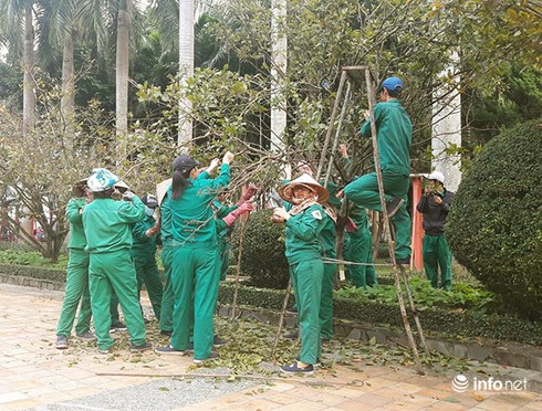 Công nhân Công ty Công viên Cây xanh Đà Nẵng vặt lá cho các cây mai ở Công viên 29/3 để chuẩn bị đón Xuân Mậu Tuất 2018 (Ảnh: HC) |