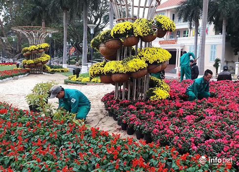 Công nhân Công ty Công viên cây xanh Đà Nẵng đang khẩn trương lắp đặt các điểm trang trí hoa trên đường Bạch Đằng để chuẩn bị đón Tết Mậu Tuất 2018 (Ảnh: HC) |
