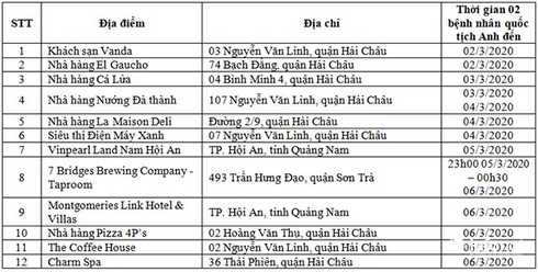 | Kêu gọi người dân, du khách tự giác khai báo trung thực Sáng 11/3, Sở Y tế Đà Nẵng ra thông báo đề nghị người dân, du khách khai báo nếu trong thời gian từ ngày 02/3 - 07/3 từng tiếp xúc với 02 bệnh nhân người Anh là M.J (1954) và K.A.C (1960) đã được xác định mắc Covid-19 Theo Sở Y tế Đà Nẵng, trong thời gian từ ngày 02/3 – 07/3, thông tin ghi nhận được cho thấy hai bệnh nhân Covid-19 quốc tịch Anh nói trên có quá trình di chuyển tại TP Đà Nẵng như sau:
