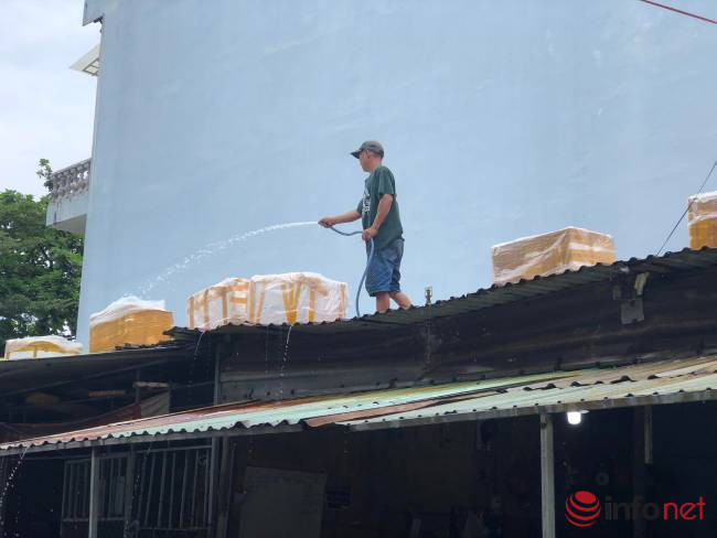Tại đường Hồ Học Lãm (quận Sơn Trà), người dân đưa hàng chục thùng xốp để đựng nước, chằng chống cho mái tôn.