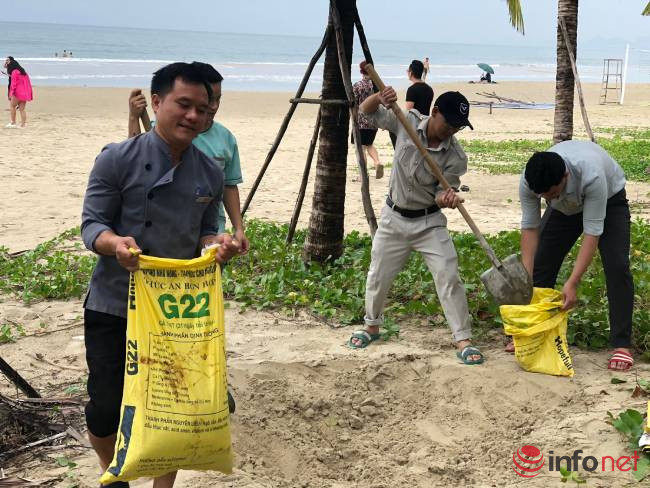 Dọc ven biển Võ Nguyên Giáp, nhiều khách sạn bố trí nhân viên xúc cát để chuẩn bị ứng phó với cơn bão số 4.