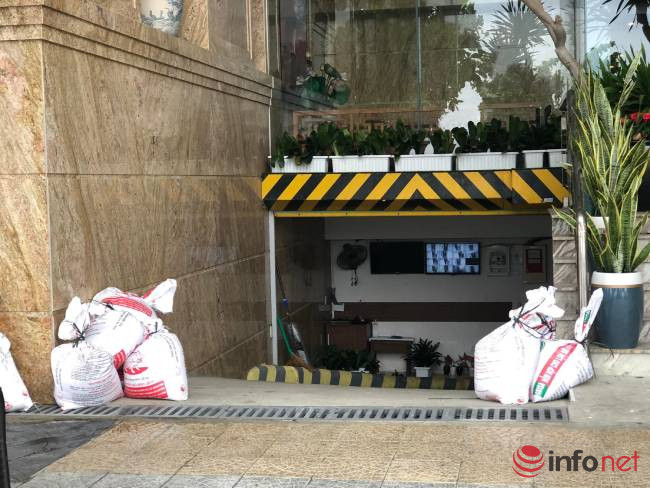 Anh Trương Minh Thông, Trưởng an ninh khách sạn Le Sands cho biết, sáng nay nhân viên khách sạn đã xúc được gần 100 bao cát để chắn trước cửa hầm, tránh nước biển tràn vào.