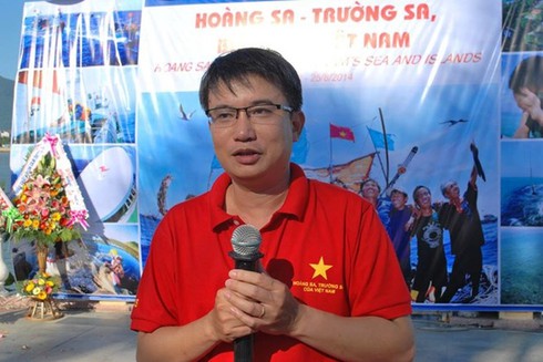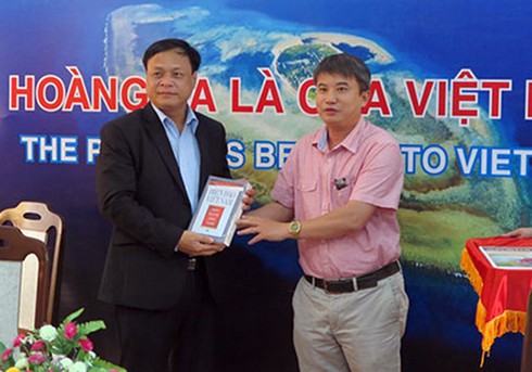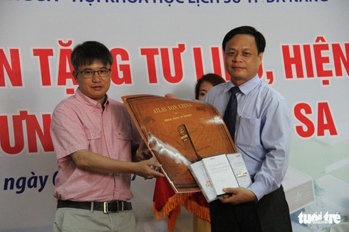 Ông Sơn cũng là tác giả nhiều công trình nghiên cứu, sách báo viết về biển đảo, đồ gốm, lịch sử… Trong ảnh: Ông Trần Đức Anh Sơn (bìa phải) chụp ảnh trong một lần tặng tài liệu chủ quyền biển đảo cho UBND huyện Hoàng Sa (Đà Năng). (Ảnh: Báo Đà Nẵng.) |