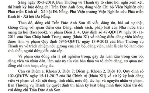 Ông Trần Đức Anh Sơn đã viết, đăng tin, bài sai sự thật, không đúng với quan điểm của Đảng, chính sách, pháp luật của Nhà nước trên mạng xã hội (facebook), vi phạm Điều 3, 4, Quy định số 47-QĐ/TW ngày 01/11/2011 của Ban Chấp hành Trung ương (khóa XI) về những điều đảng viên không được làm; Trong ảnh: Ông Trần Đức Anh Sơn (ảnh: Vietnamnet) |