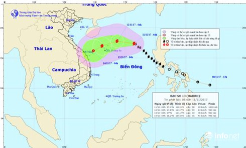 Dự báo hướng di chuyển của bão số 13 (Nguồn: Trung tâm Dự báo khí tượng thủy văn Trung ương) |