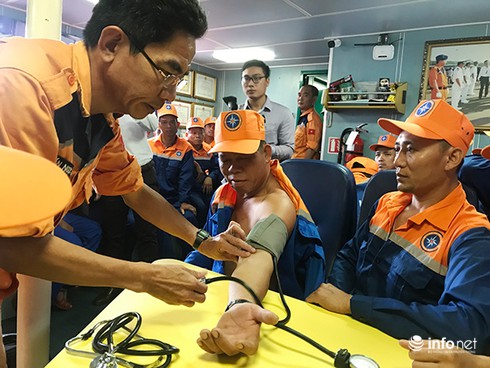 Các ngư dân tàu cáQNa 90129 TS được các bác sĩ trên tài SAR 412 chăm sóc sức khỏe... |